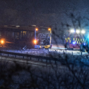 Bus glider af motorvej i snevejr i København