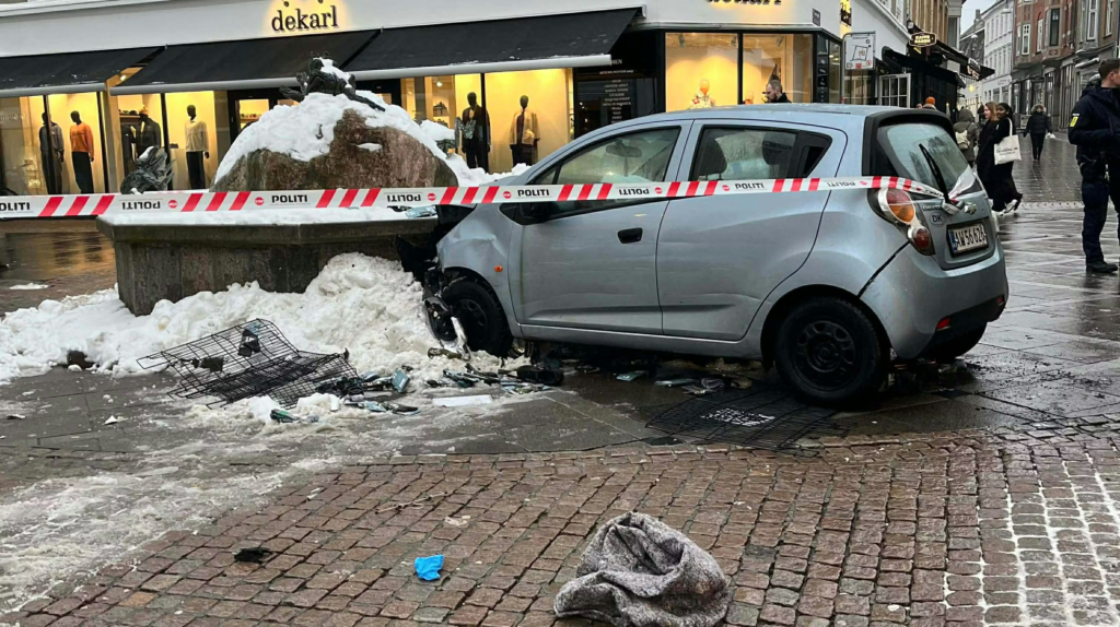 Bilen kom kørende med retning fra Vesterbro, hvorefter den stoppede efter påkørslen af et springvand i krydset ved Vesterå.