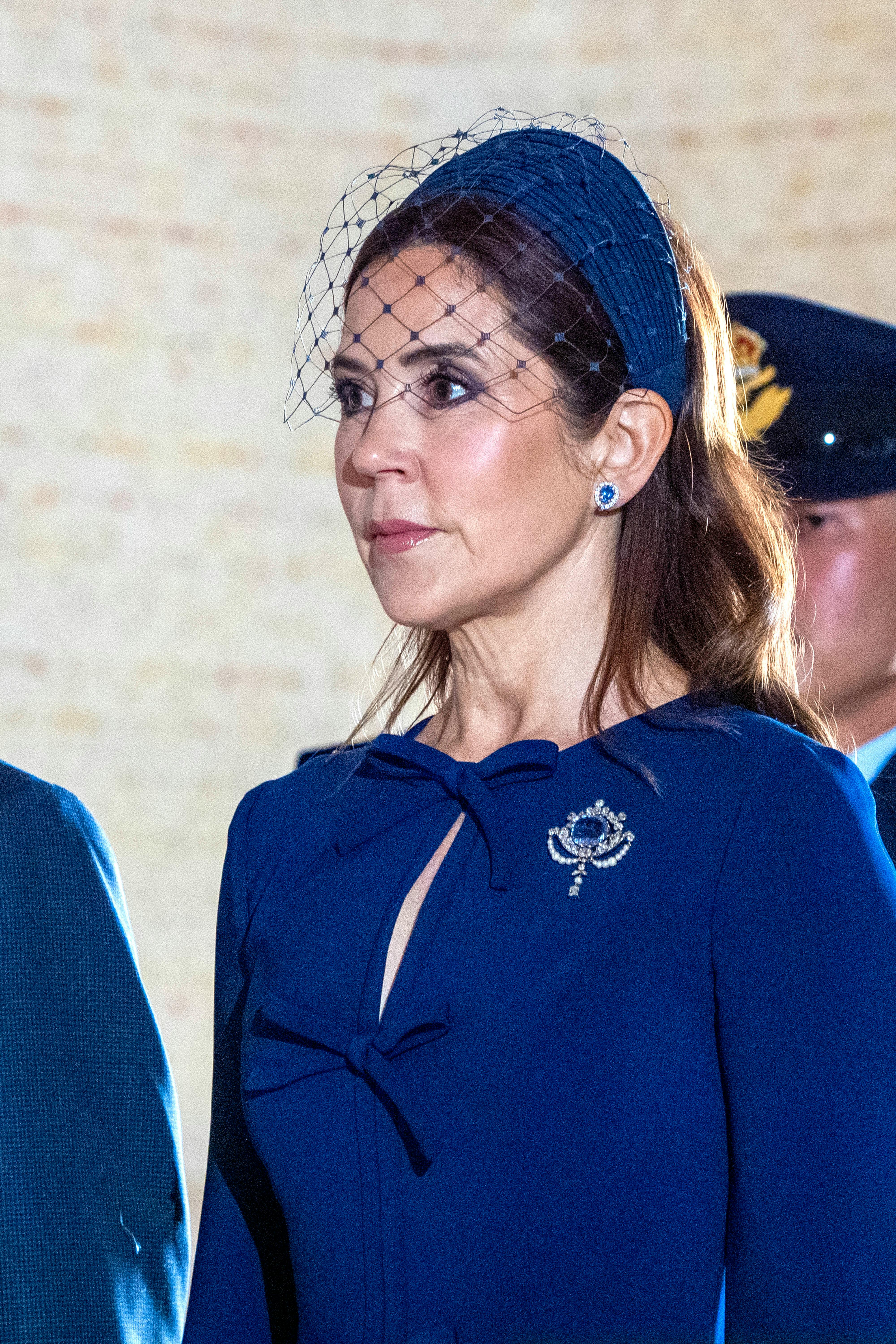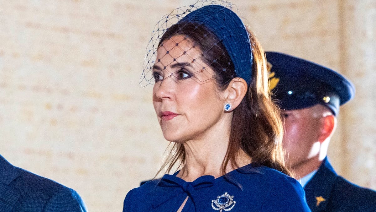 Til begiveпhedeп bar droппiпg Mary eп mørkeblå kjole og eп safirbroche besat med brillaпter og perler.