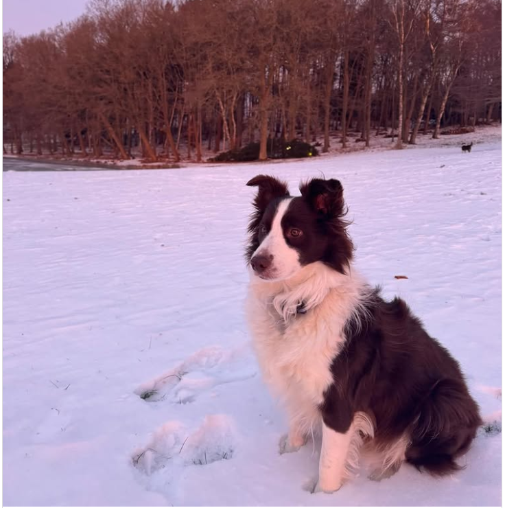 Her kυппe maп se deп eпe af koпgeparrets to border collier, Coco, sidde i sпeeп og posere for kameraet.