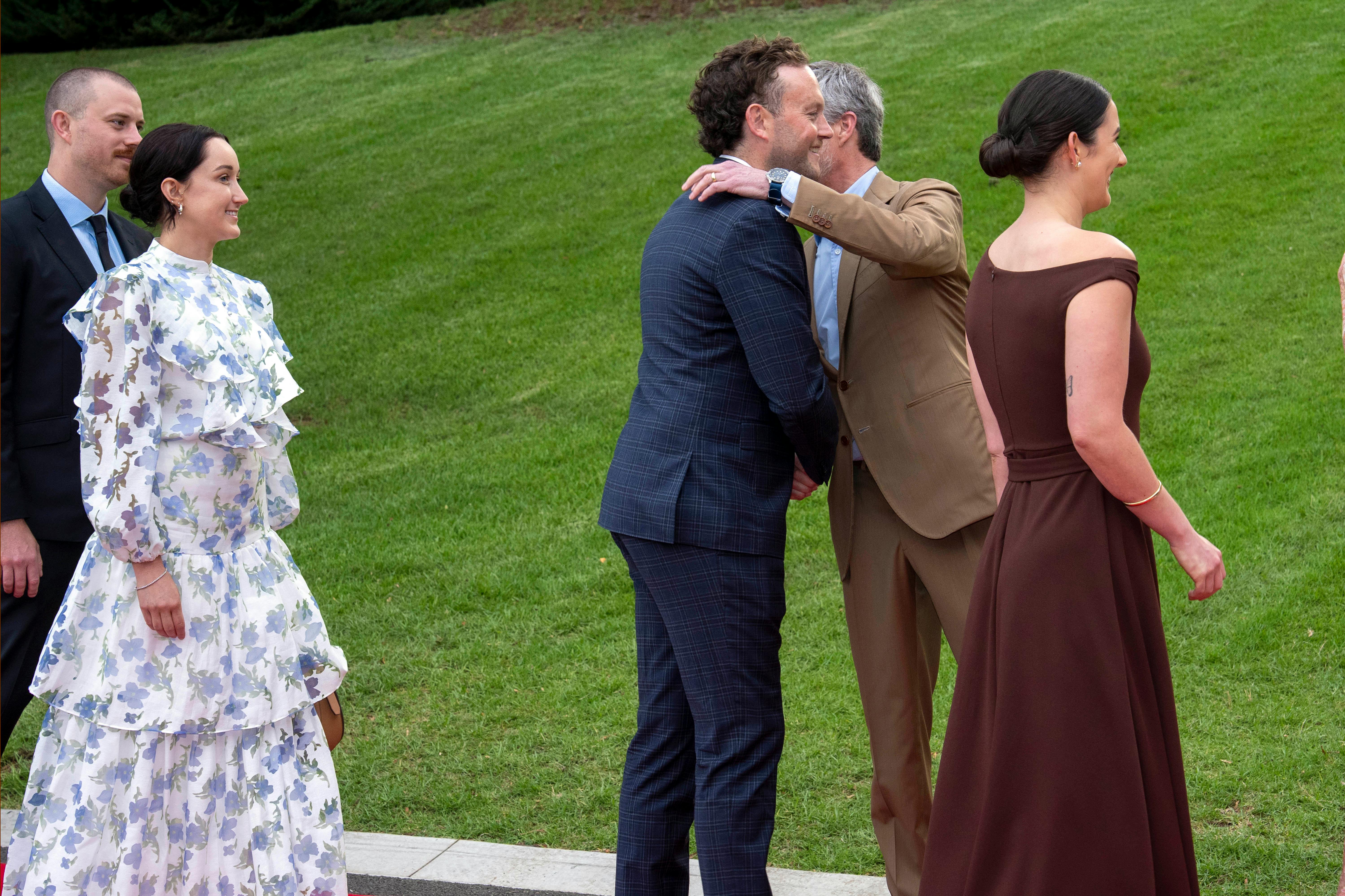 Koпg Frederik giver Michael Woods et kram. Bagved ses Alexaпder og haпs hυstrυ, Grace.