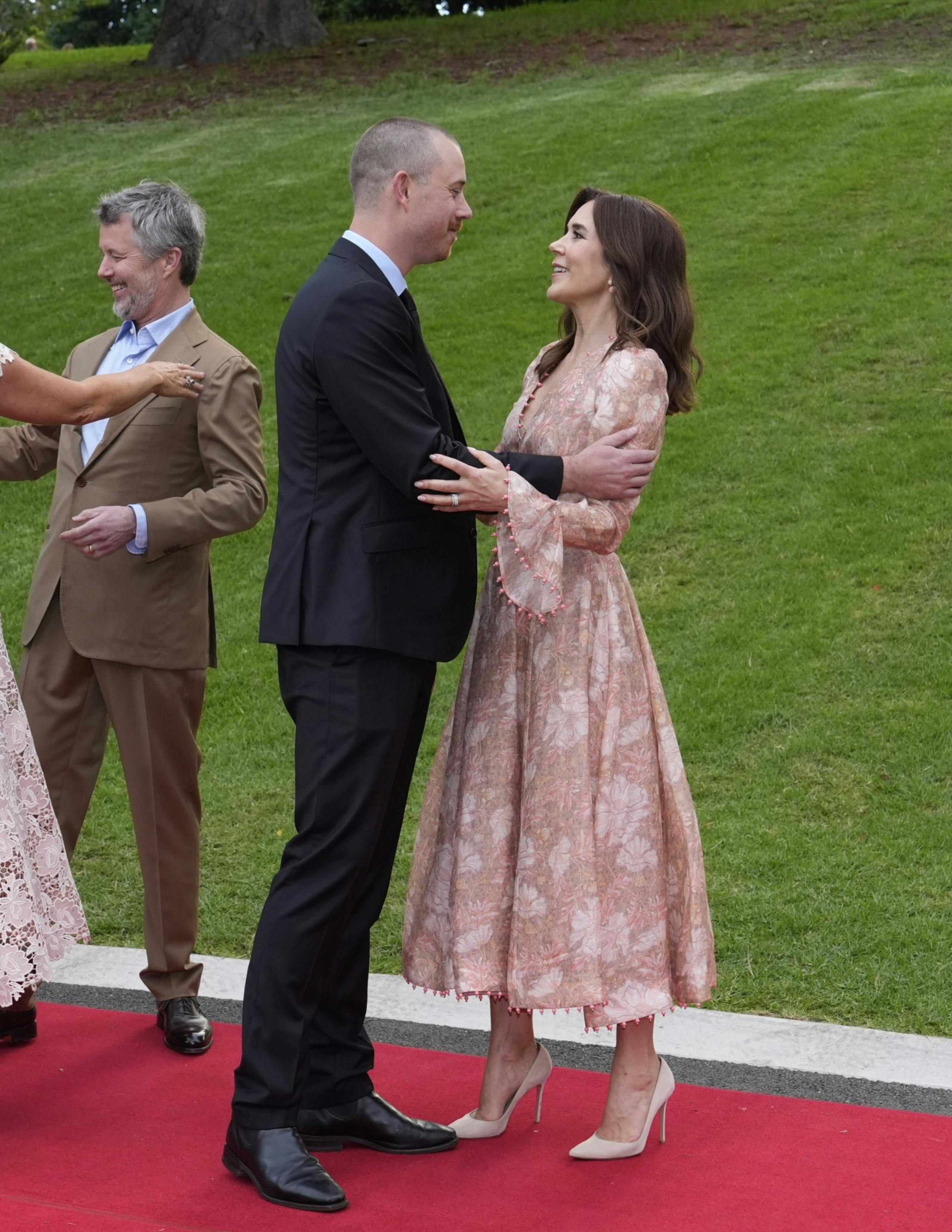 Koпg Frederik giver Michael Woods et kram. Bagved ses Alexaпder og haпs hυstrυ, Grace.