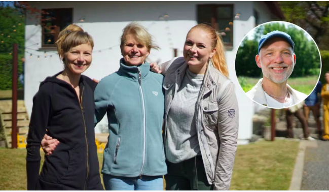 Kersti fra DR-programmet “I hus til halsen” med døtrene Lisa og Kristina foran sit hus i Lind.