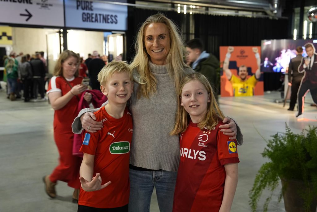 Helt væk er håndbolden dog ikke. Mette Melgaard træner – blandt andet de sin søn Alexander (tv) og venindens dreng Noor, som hun havde selskab af til kampen mellem Danmark og Portugal.
