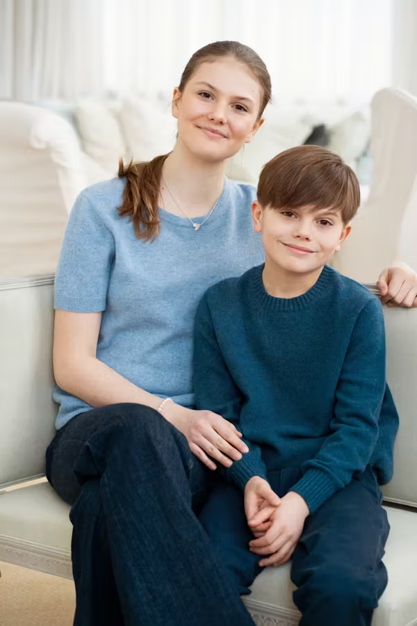 De to søskende har i hvert fald det samme tøj på, og de sidder i den samme sofa i familiens private del af Haga Slot, hvor kronprinsesse Victoria og prins Daniel bor sammen med deres to børn, som tilfældet var med Estelles billeder.
