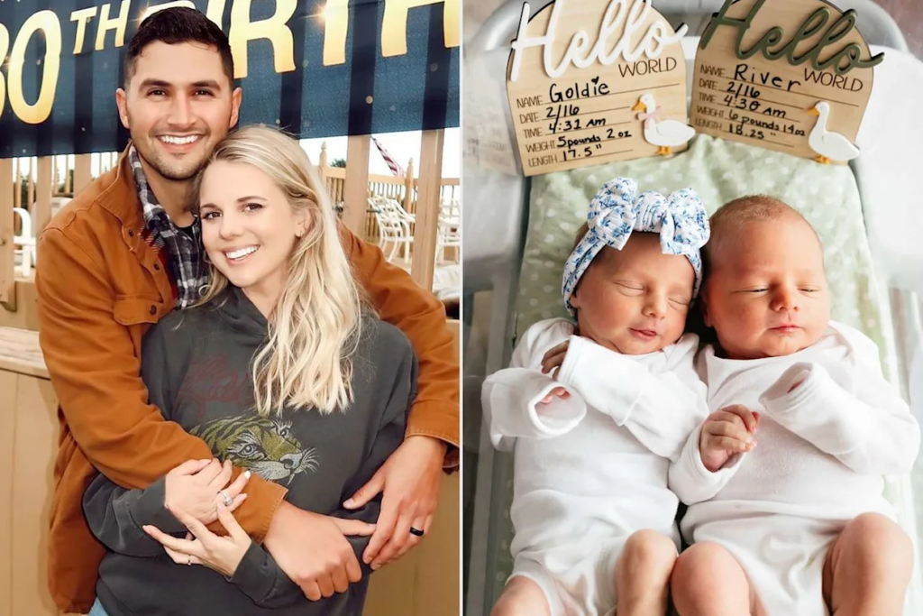 Nicole Franzel og Victor Arroyo fortæller i opslaget, at tvillingerne har fået navnene Goldie Jen og River David.